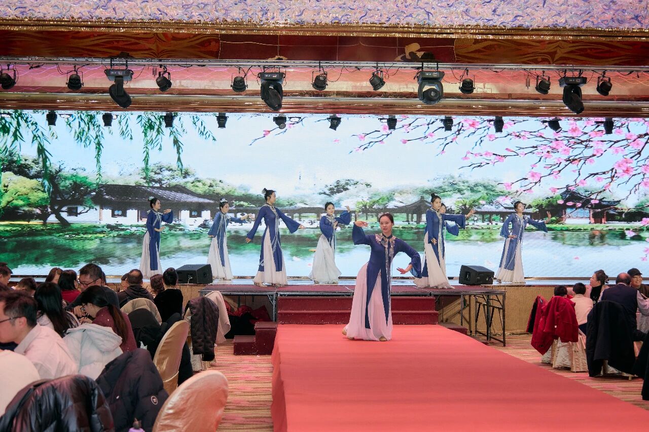 除了喜庆的开场舞,茉莉花歌舞团还带来了充满韵味的舞蹈《江南水韵》,柔美的舞姿仿佛将江南春色带到了宴会厅。