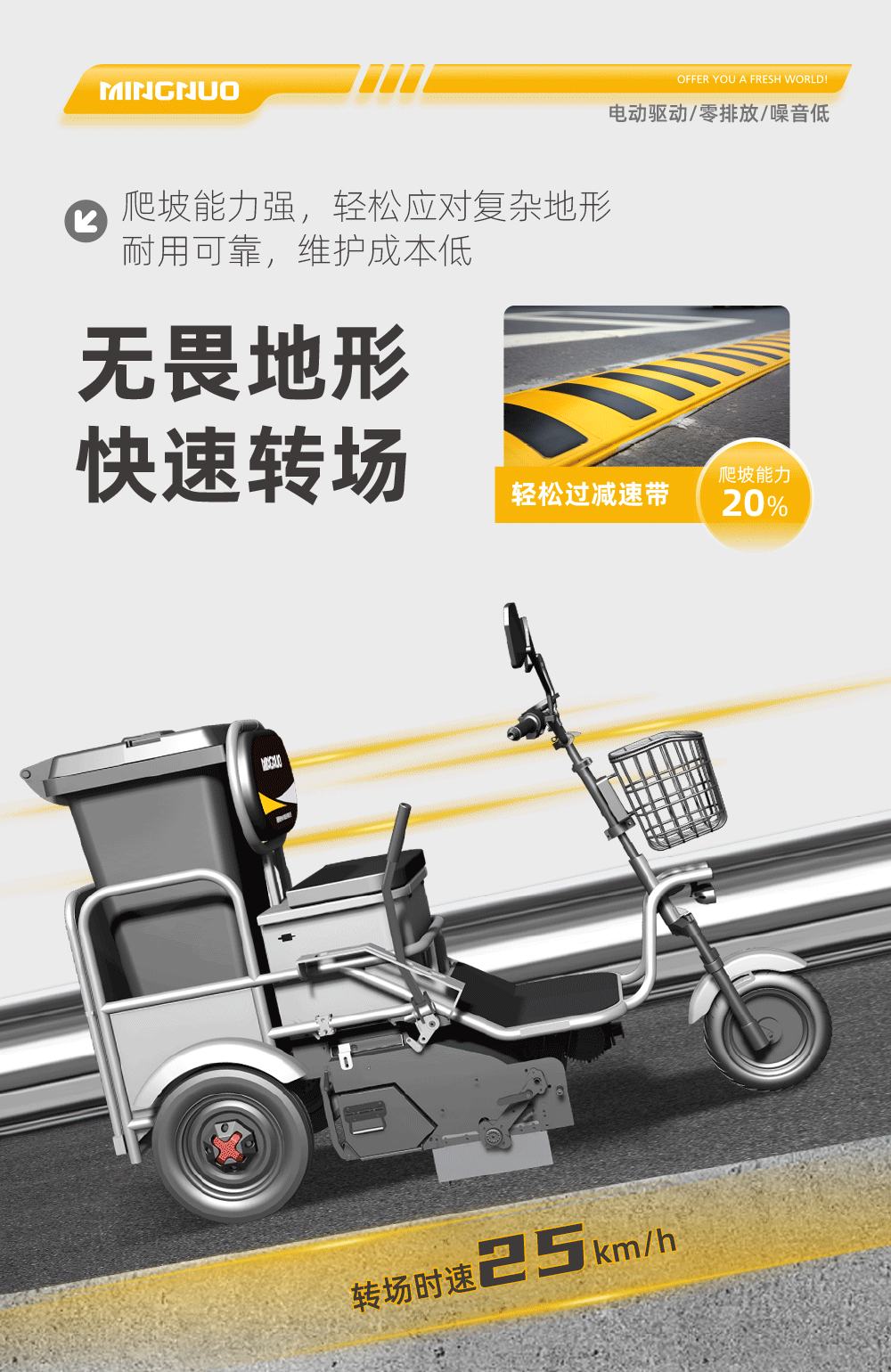 l强劲动力,无惧地形。20%爬坡能力,轻松应对地下车库、坡道、减速带等复杂路面,120mm高马路牙轻松跨越,无惧路沿台阶障碍,适应性强。