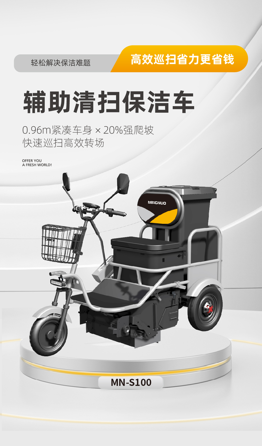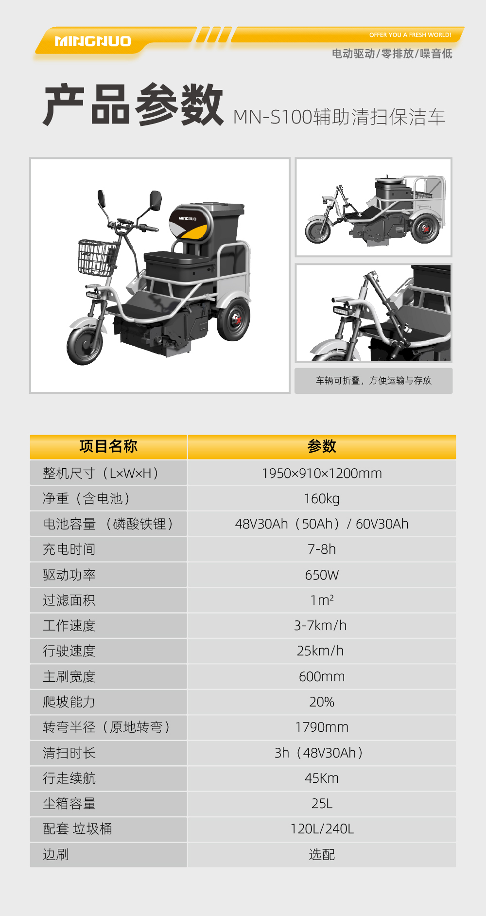 MN-S100辅助清扫保洁车,整车方便灵活,随走随停,仅需一人就可操作,且易清洗,装卸方便,便于垃圾收管、储存、清运。适用城镇街道、工厂、学校、医院、居民生活区、机关单位等路段垃圾收集和巡回保洁使用。