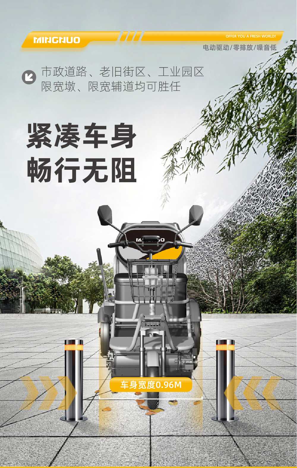 l小巧车身,畅行无阻仅960mm宽车身的设计,轻松穿越限宽桩、人行道、小区窄路等复杂场景,解决传统保洁车辆无法进入的痛点。