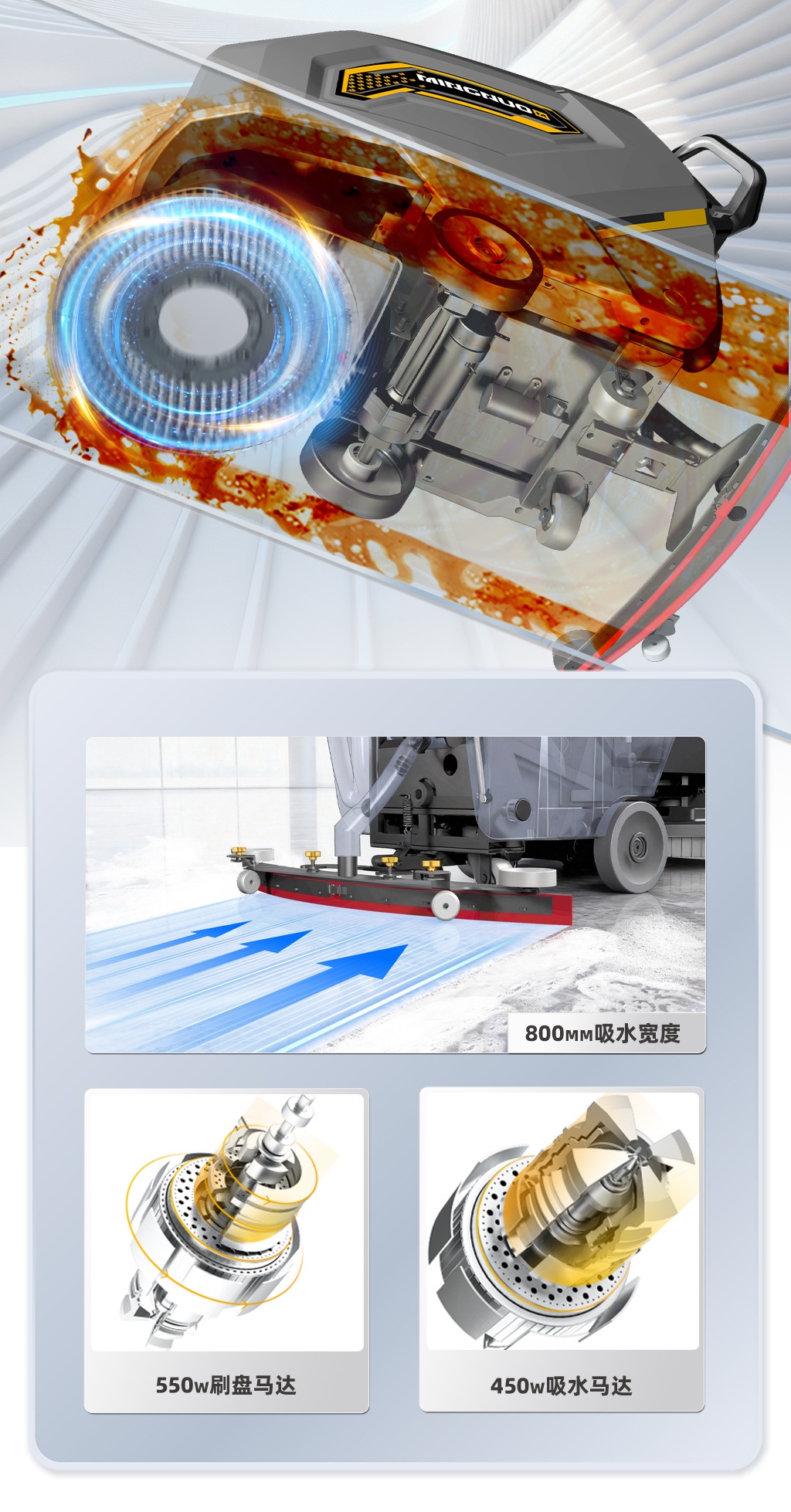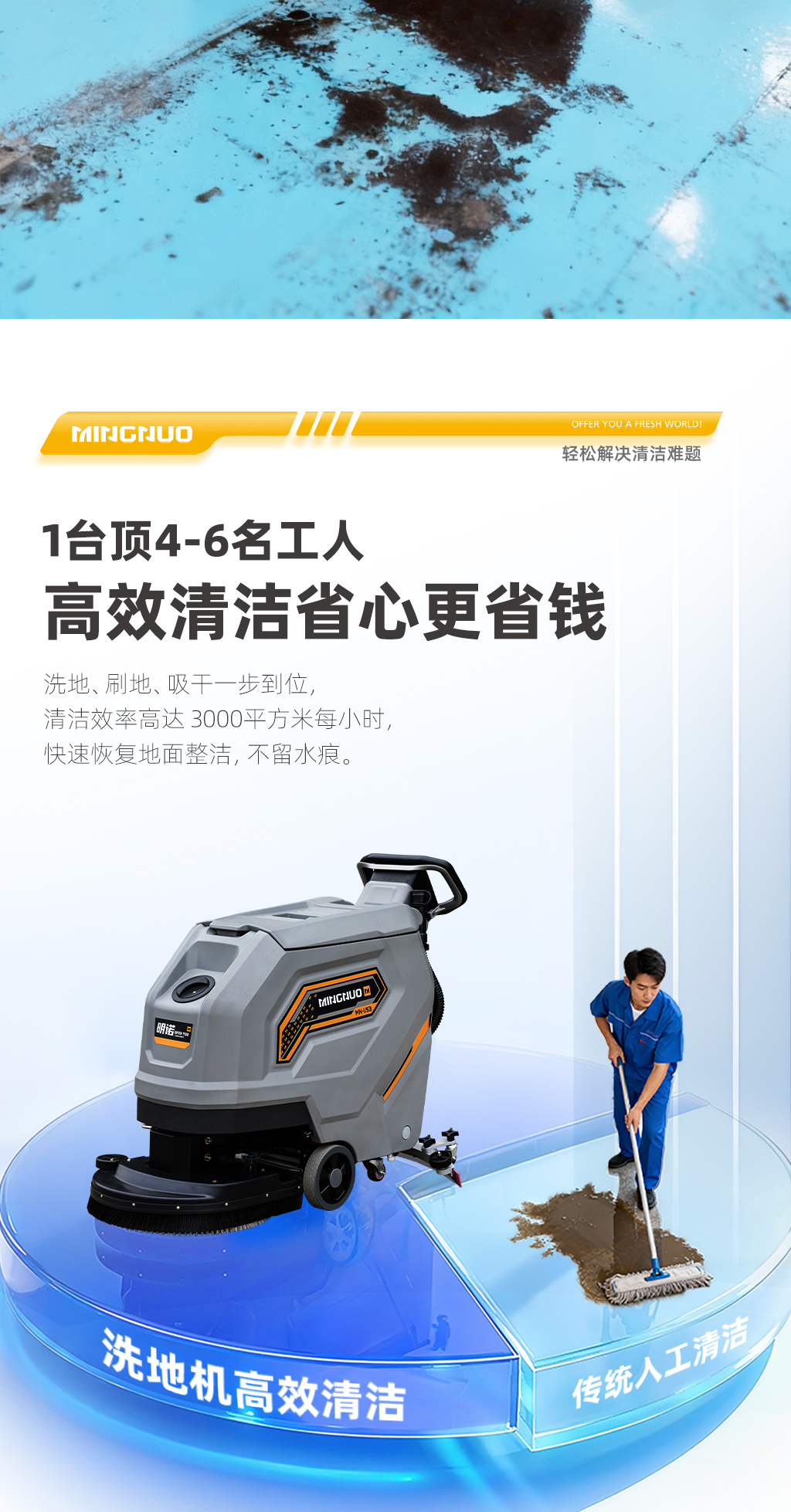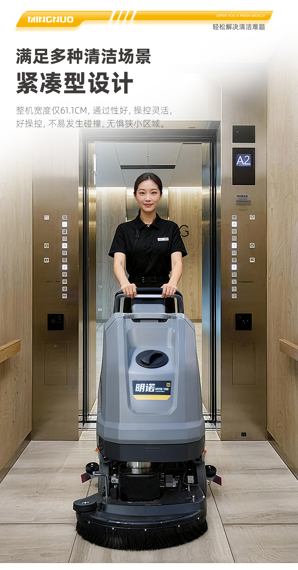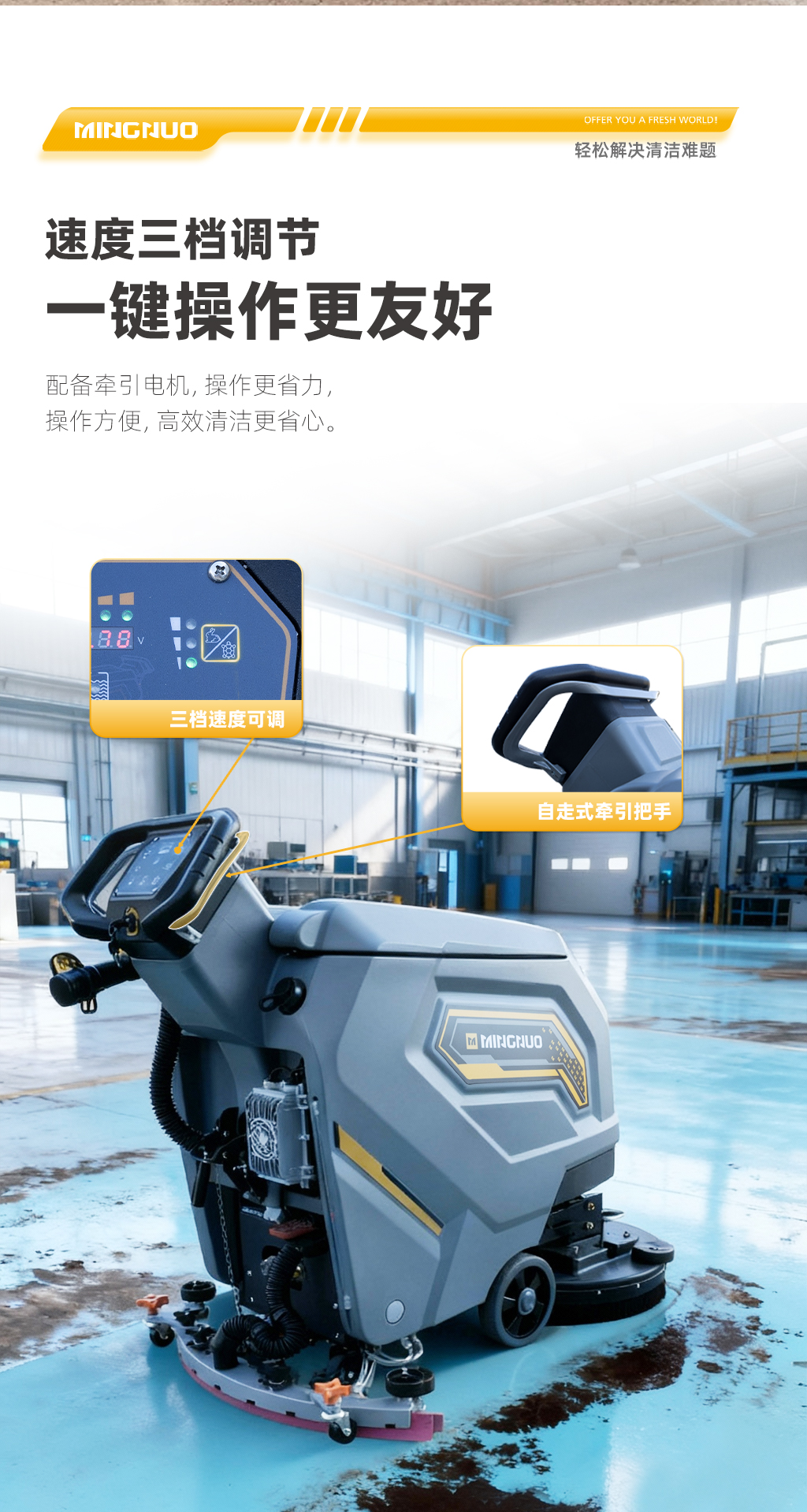 MN-V53手推自走式洗地机主要适合瓷砖、大理石、环氧地坪等大面积清洗,可添加清洁剂清理油污地面。配备 60L 清水和 65L 污水箱,是一款坚固可靠的洗地机。充足续航支持长时间作业,配合有力的触地压力,轻松应对大型商业场所清洁任务,广泛应用在零售店、生产工厂、仓储大厅和较小的物流仓库、购物中心、会议中心、机场、停车场、火车站等领域。