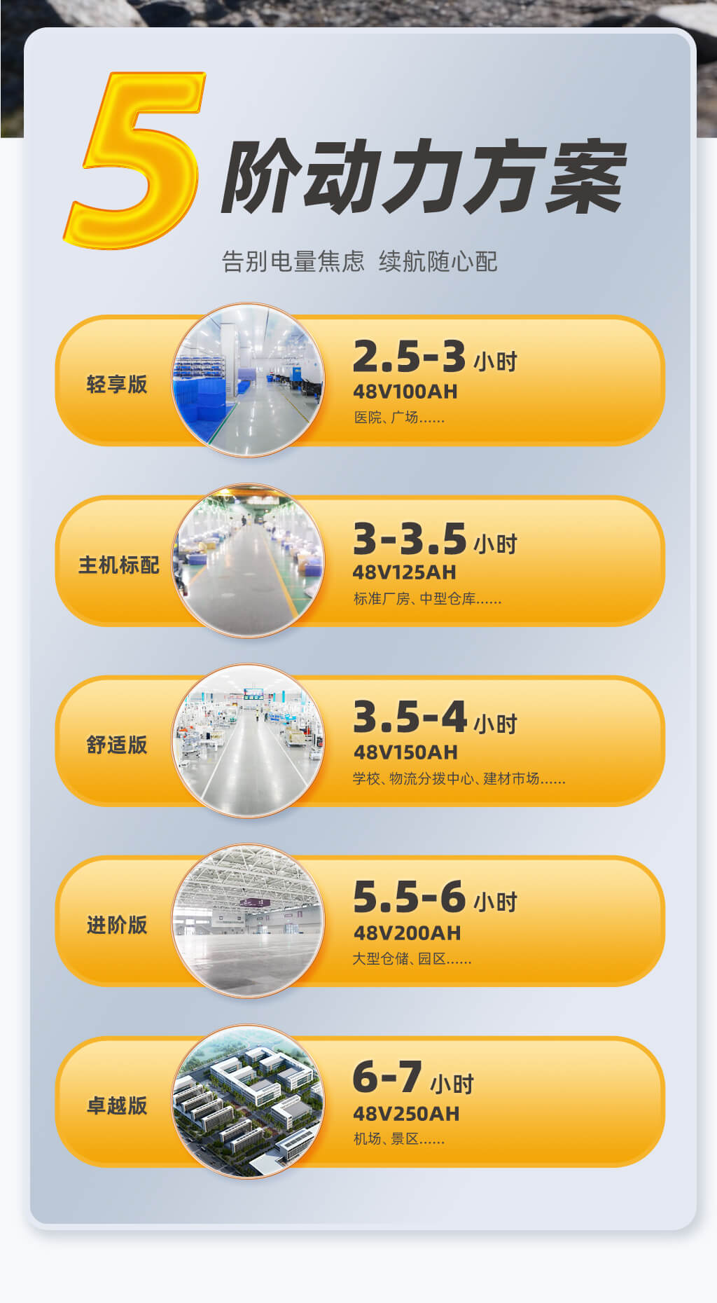 l标配 48V150Ah 锂电池组,续航 4-6小时;采用A品电芯循环次数3000次以上,质保 3年,实际寿命 8年以上。