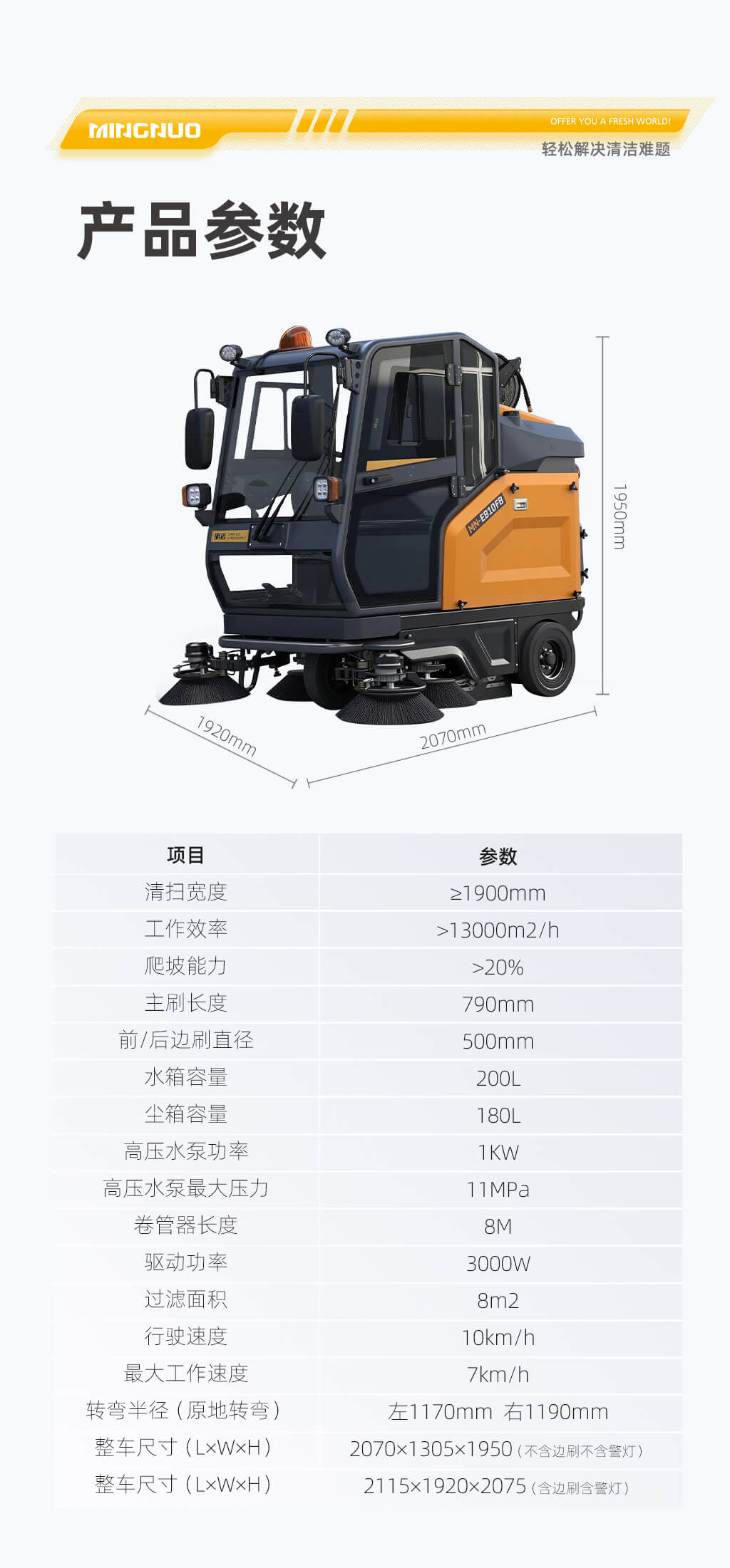1 | 整车尺寸(L×W×H) | mm | 2070×1305×1950(不含边刷不含警灯) 2115×1920×2075(含边刷含警灯) |