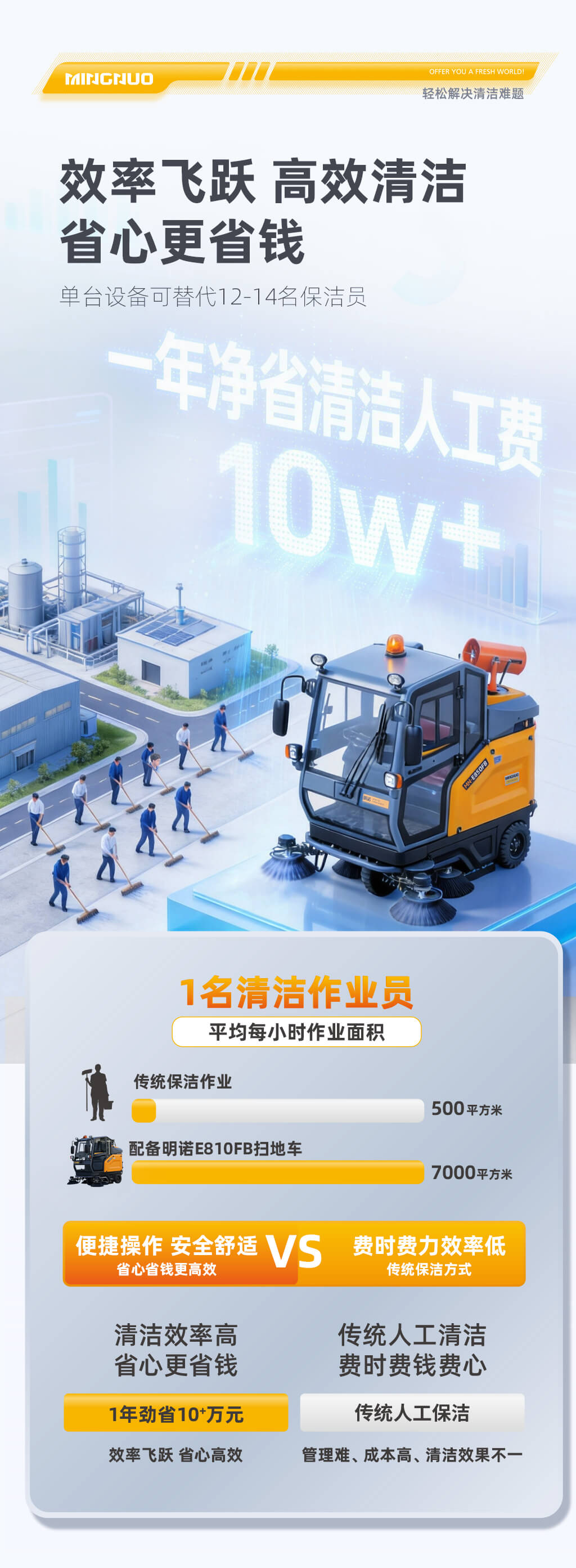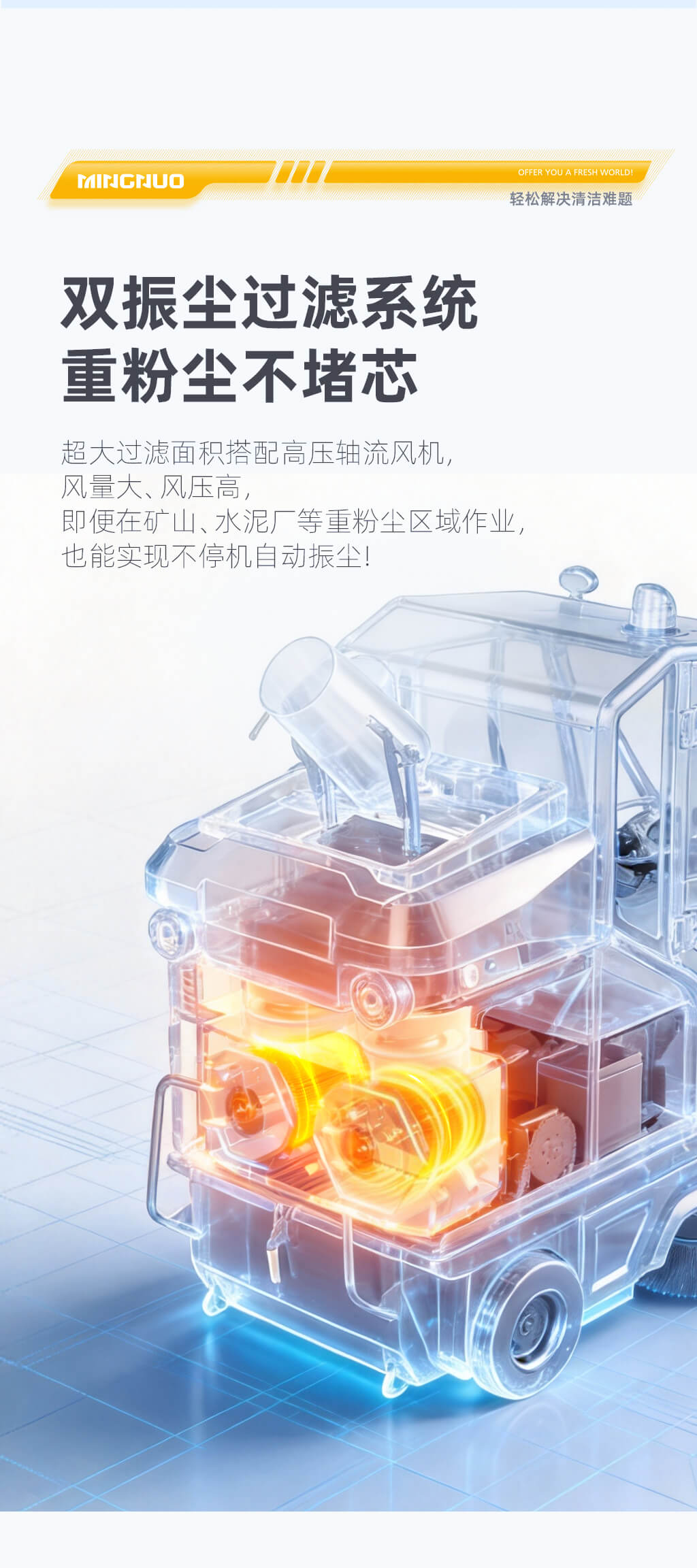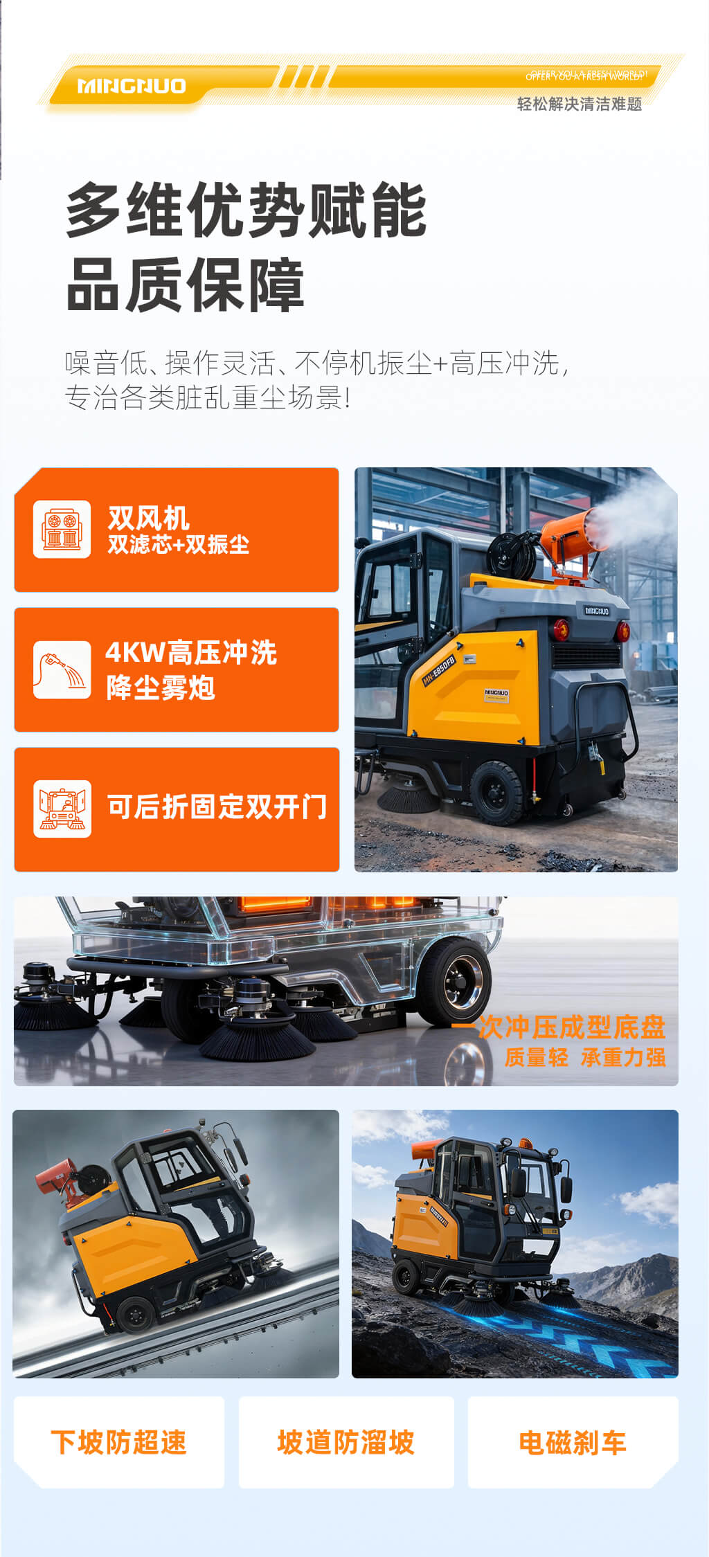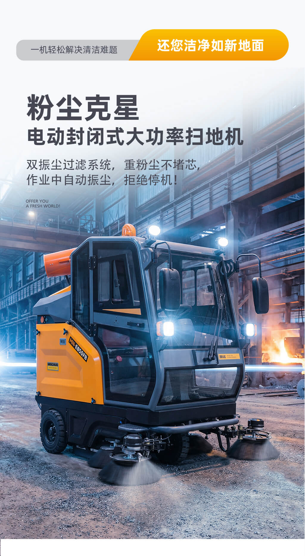 MN-E850FB是一款电动封闭式大功率扫地机,采用双风机双滤芯双振尘过滤系统,过滤面积大,作业过程中实现不停机自动振尘,清扫效果好,作业效率高,标配48V200Ah大容量锂电池,续航时间长,配置4KW高压冲洗和雾炮,可冲洗果壳箱、小广告以及降尘作业。大容量水箱可满足长时间喷淋、冲洗作业,适合工商业多场景应用。