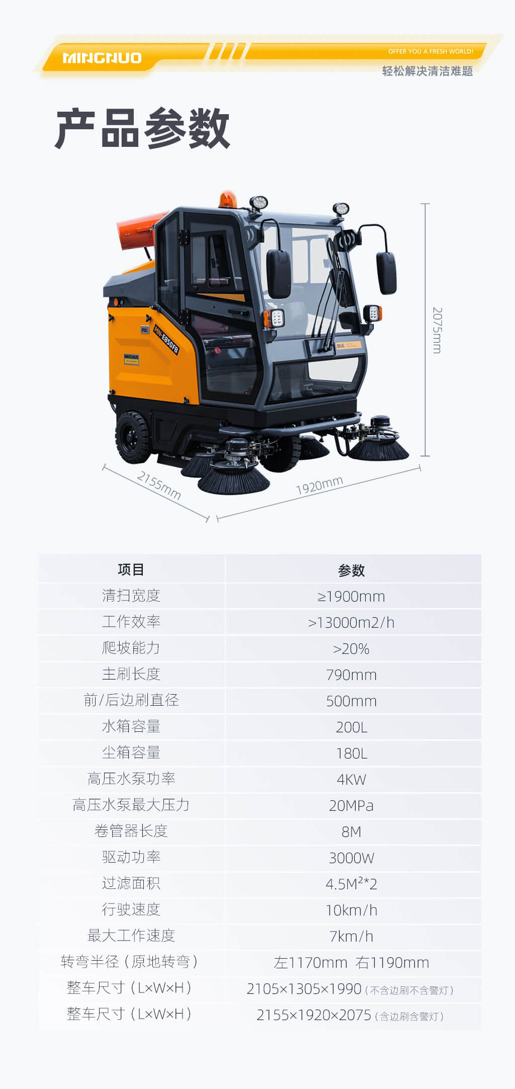 1 | 整车尺寸(L×W×H) | mm | 2105×1305×1990(不含边刷不含警灯) 2155×1920×2075(含边刷含警灯) |